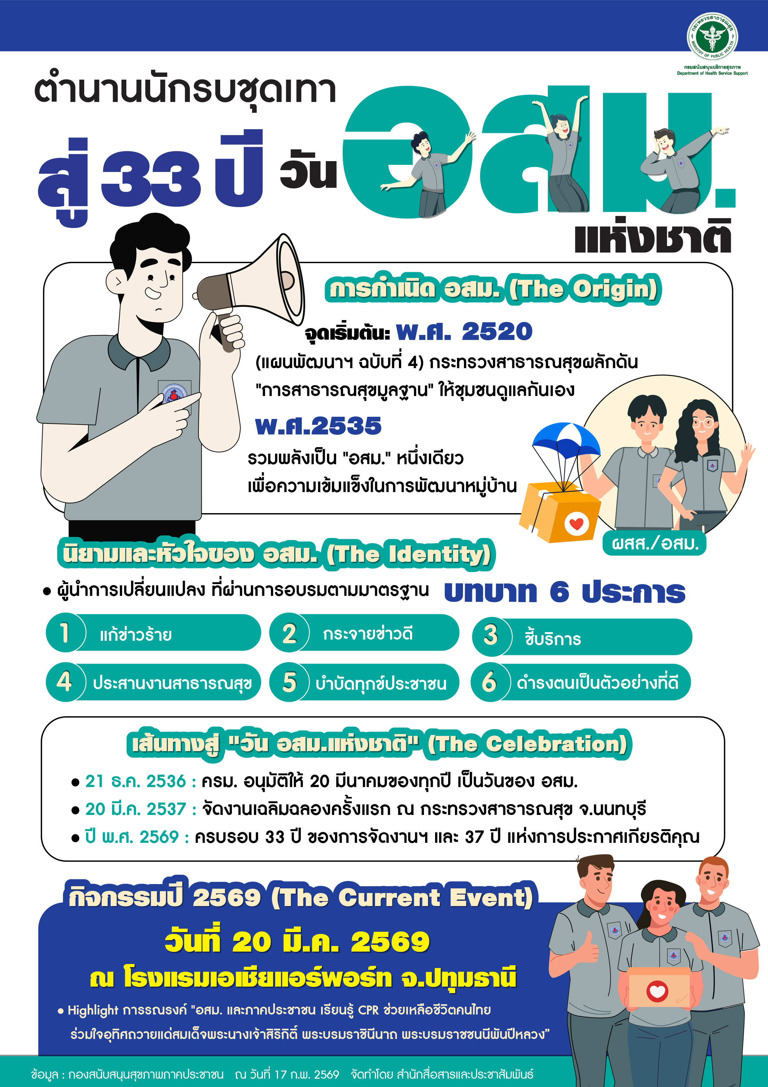 เนื่องในโอกาส วันอาสาสมัครสาธารณสุขแห่งชาติ 20 มีนาคม 2569 นี้ กระทรวงสาธารณสุขเตรียมจัดพิธีมอบรางวัลและเชิดชูเกียรติให้กับ อสม. ดีเด่น เพื่อเป็นการขอบคุณในความทุ่มเทดูแลสุขภาพคนในชุมชนอย่างไม่ย่อท้อ อสม. ยุคใหม่ เชื่อมต่อเทคโนโลยีกับชุมชน สู่สาธารณสุขยุคพัฒนา ในปีนี้เราพร้อมก้าวไปอีกขั้นกับการนำเทคโนโลยีมาปรับใช้ในการทำงาน เพื่อประสิทธิภาพการดูแลพี่น้องประชาชนที่ดียิ่งขึ้น โดยมีการมอบรางวัลเชิดชูเกียรติใน 4 ระดับ ได้แก่: ✅ ระดับชาติ ✅ ระดับภาค ✅ ระดับเขต ✅ระดับจังหวัด ร่วมส่งกำลังใจและแสดงความยินดีกับ อสม. ผู้ได้รับรางวัลทุกท่านที่ทำหน้าที่เป็นสะพานเชื่อมความรู้และสุขภาพที่ดีสู่ทุกหลังคาเรือน